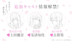 Read More竹嶋えく原作によるTVアニメ「ささやくように恋を唄う」の追加キャストが発表に。里宮百々花役を上田麗奈、天沢始役を安済知佳、水口未希役を古賀葵が演じる。 上田が演じる百々花は、おしとやかな性格の女の子。料理好きで、ひまりを…